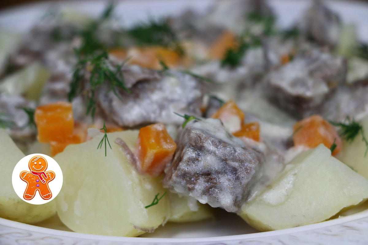 7. При подаче на стол выложить отварной картофель и сверху разместить мясо, посыпанное зеленью.