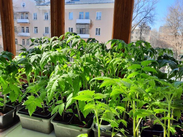 Нельзя забывать и про освещение: согласно наблюдениям, томаты наиболее эффективно развиваются при 12-14 часах светового дня. В солнечные теплые дни можно обойтись без дополнительной подсветки, однако в пасмурные дни стоит использовать фитолампы, чтобы избежать вытягивания растений.