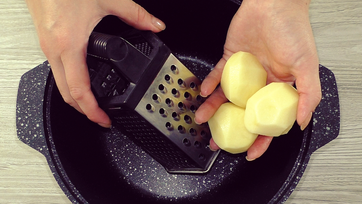 Приготовление начинается с картофеля: его нужно натереть на тёрке, а затем при желании можно измельчить с помощью блендера для достижения однородной массы. Далее следует добавить яйца и молоко, а затем приправить солью и перцем по вкусу. После этого вводится мука, и все ингредиенты тщательно перемешиваются.