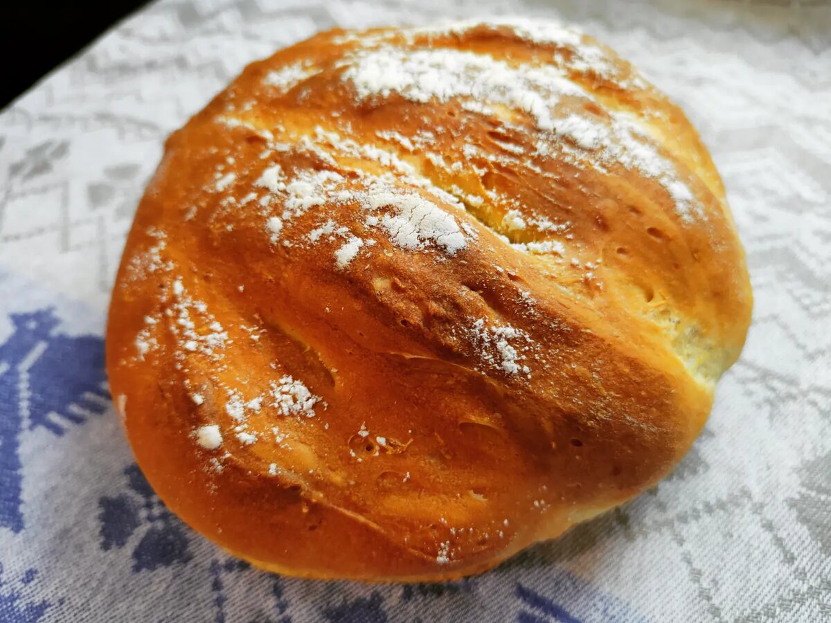 Тесто округляем и оставляем подниматься на один час под полотенцем. По истечении времени его нужно слегка обмять и разделить на две части, формируя округлые булки, которые помещают на противень. Не забудьте сделать надрезы и немного посыпать мукой для красоты!