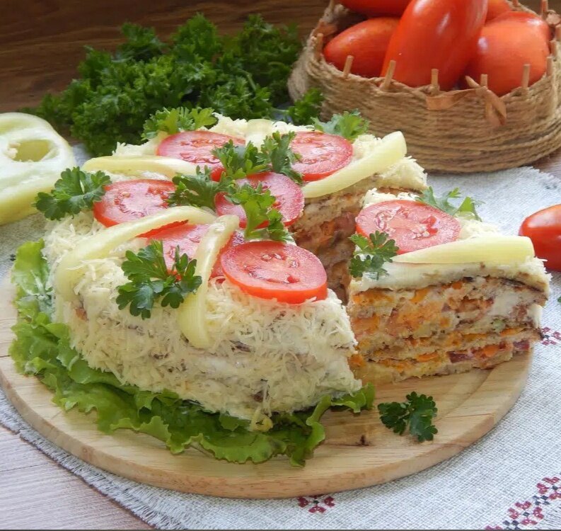 Украсить торт кружочками помидоров, болгарским перцем и листьями петрушки для яркости.