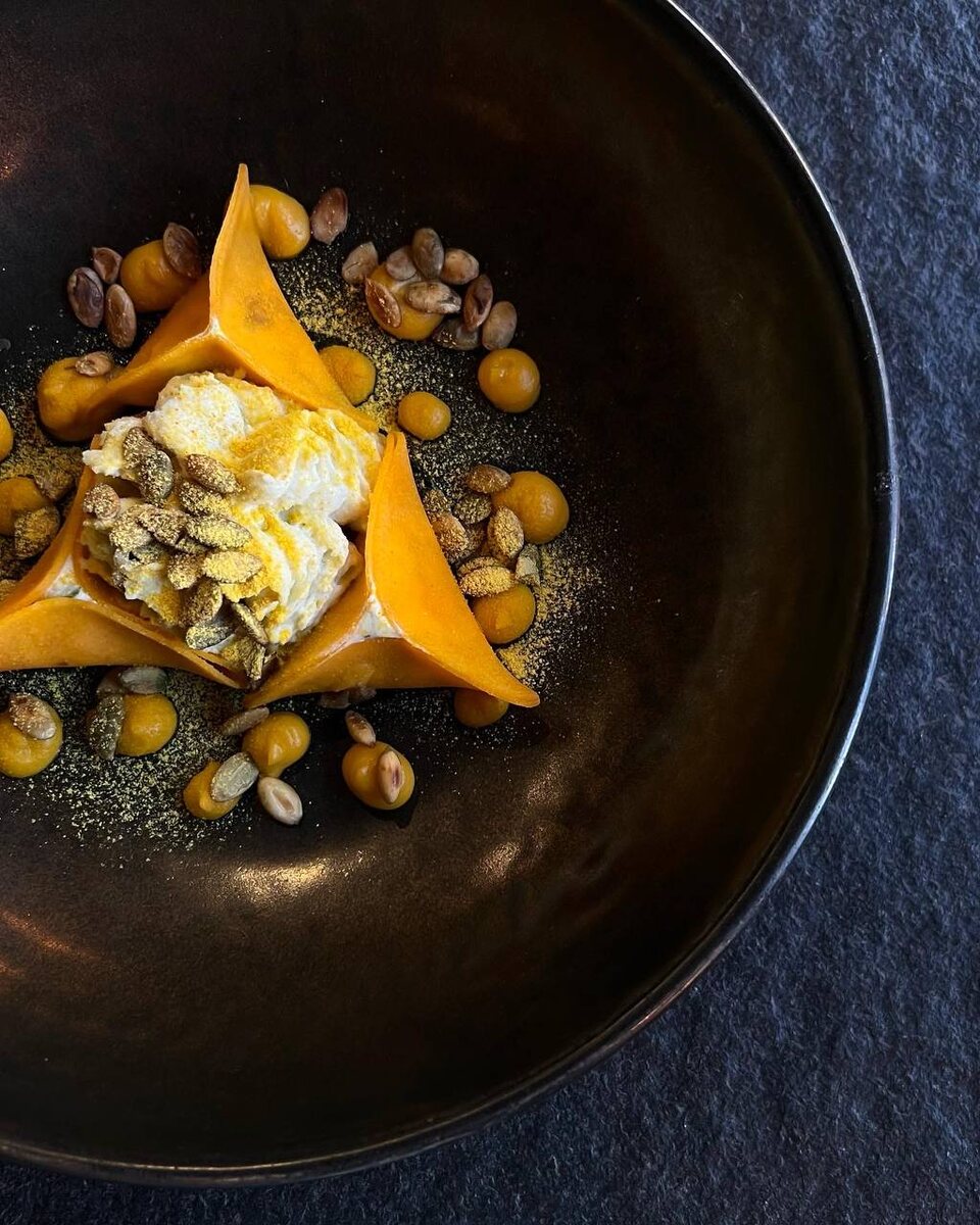 Остатки тыквы запекаются вместе со специями, включая кардамон и розмарин, заправленные каплей мёда, при температуре 140°C. Это позволяет сахаром карамелизироваться и придаёт блюду глубокий вкус. Запеченная тыква затем превращается в крем, к которому добавляется немного сливочного масла.