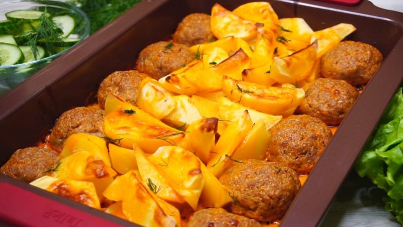 Пока фарш настаивается, подготовьте противень: смажьте его растительным маслом. Сформируйте из фарша котлеты и разместите их по краям формы. Среднюю часть оставьте для картошки, нарезав 6-7 клубней на дольки. Прогрейте духовку до 220°C и поставьте форму на 15 минут.