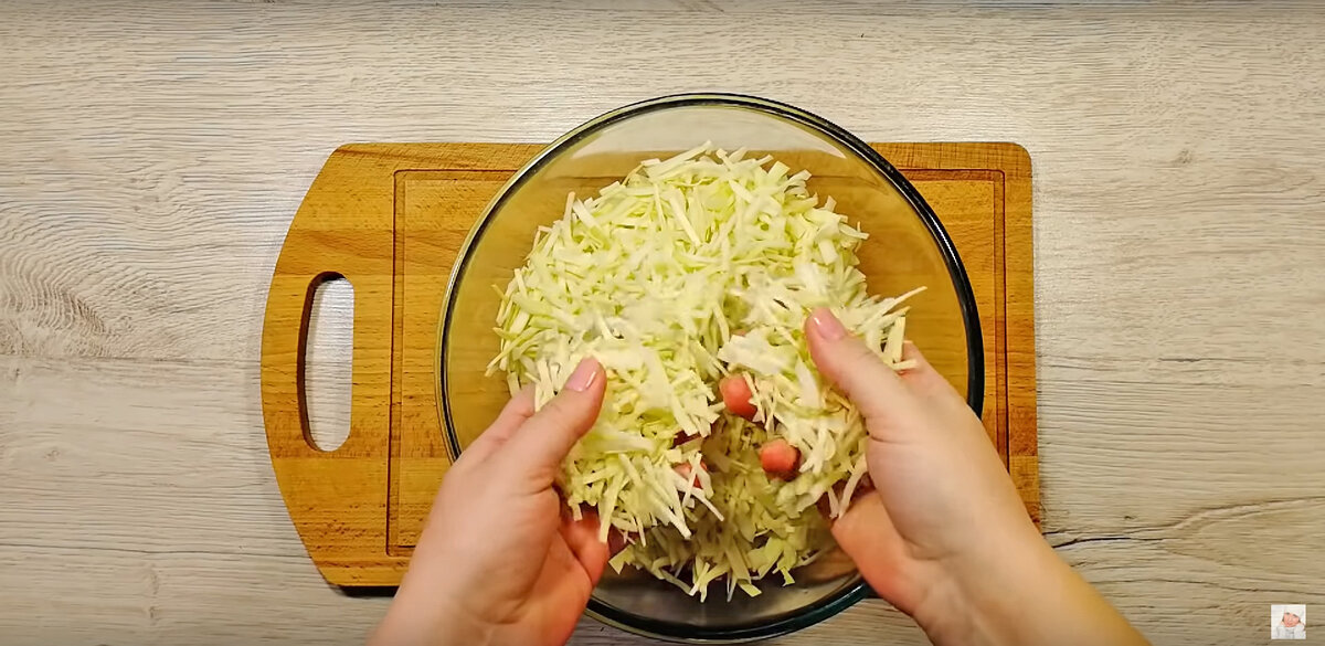 Для начала следует основа: 500 граммов свежей капусты необходимо нарезать на мелкие кусочки. После этого капусту слегка посолить и тщательно перемешать, чтобы она потеряла свою жесткость. Пройдет несколько минут, и ее можно будет хорошо помять, чтобы сделать мягче.