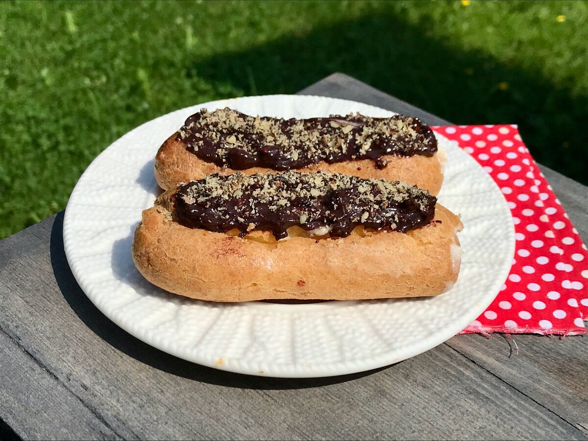 Когда эклеры остынут, срежьте сверху и щедро наполните их кремом. При желании, украсьте шоколадной глазурью и посыпьте рублеными орехами. Уберите эклеры в холодильник минимум на час — так они станут даже вкуснее!
