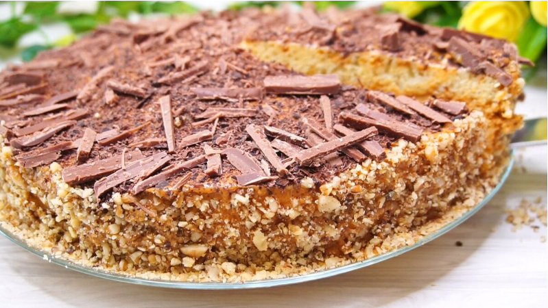 Разрезав бисквит на 2-3 части, каждую смазывают пропиткой и кремом, украшают по желанию — это могут быть орехи или шоколад. Нужно дать торту пропитаться хотя бы 20 минут, и его можно подавать к чаю!