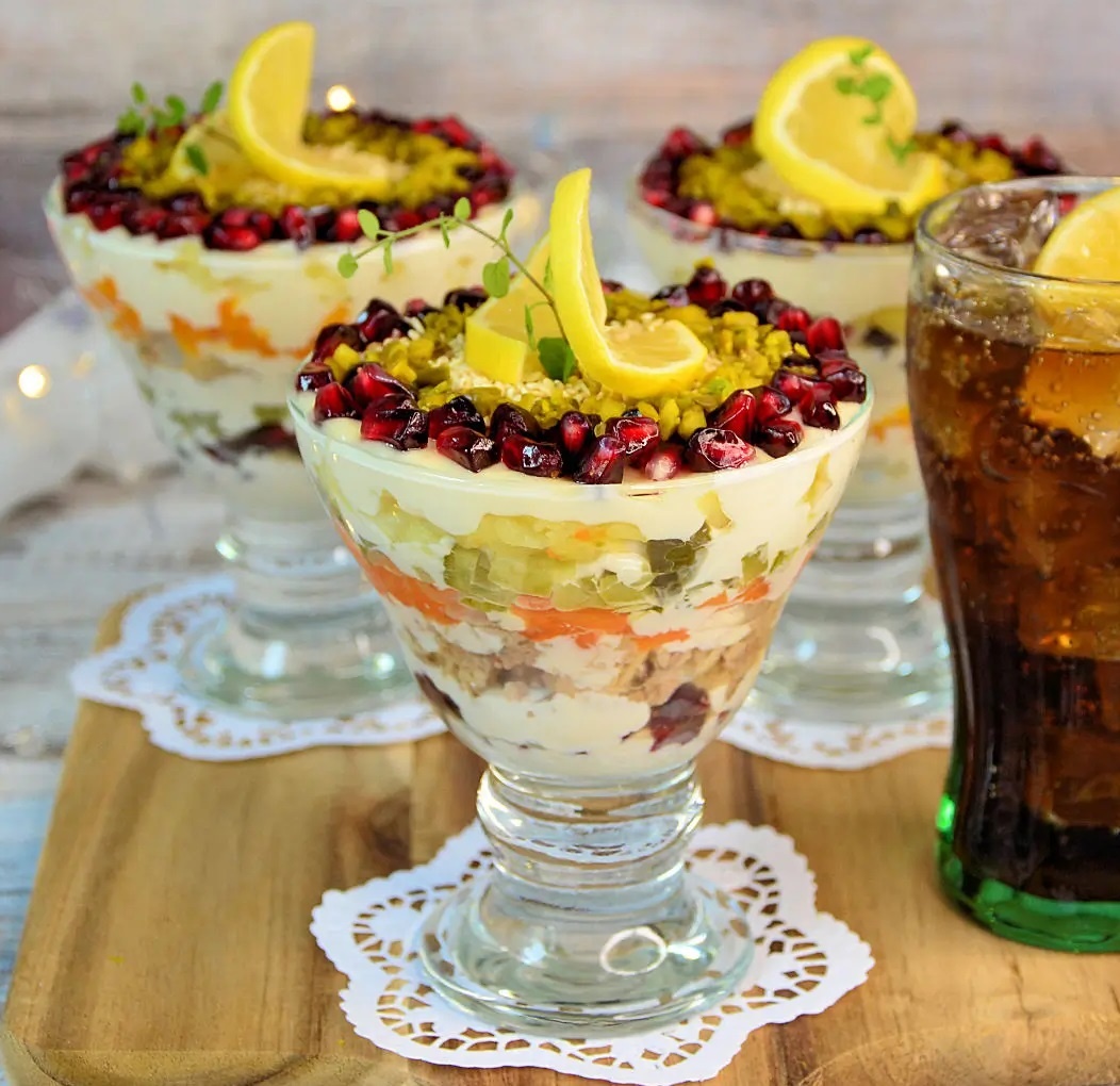 Собирать шедевр следует в небольших порционных салатниках или фужерах: сначала майонез, затем зерна граната, снова майонез, рыба, майонез, морковь, майонез, огурцы, майонез и, наконец, слой картофеля с украшением.