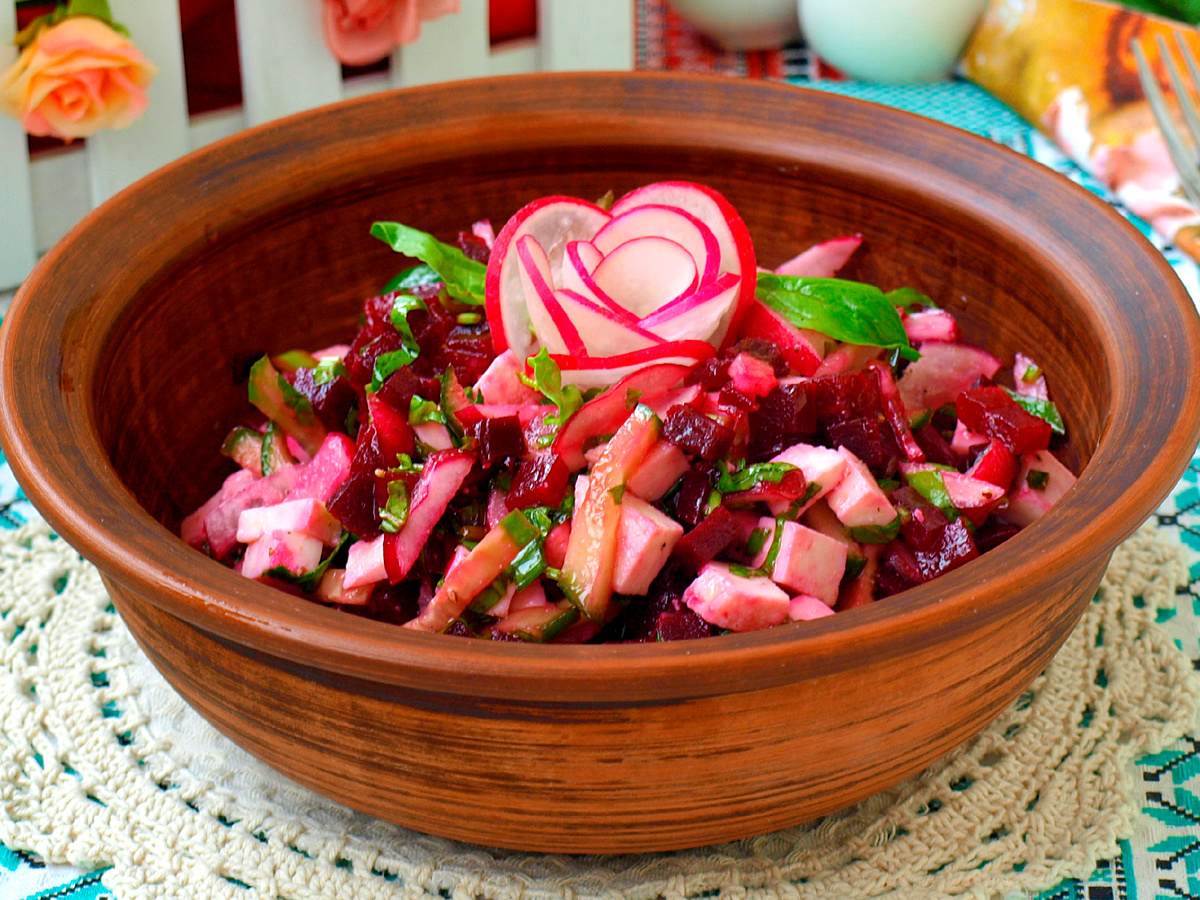С наступлением весны приходит желание попробовать что-то более легкое и освежающее. Салат, который сочетает яркую свеклу с первыми весенними овощами, идеально подойдёт для этого. Хрусткий редис, свежий огурец и зелёный лук наделят привычную свеклу совершенно новым вкусом, а процесс его приготовления окажется быстрым и приятным.