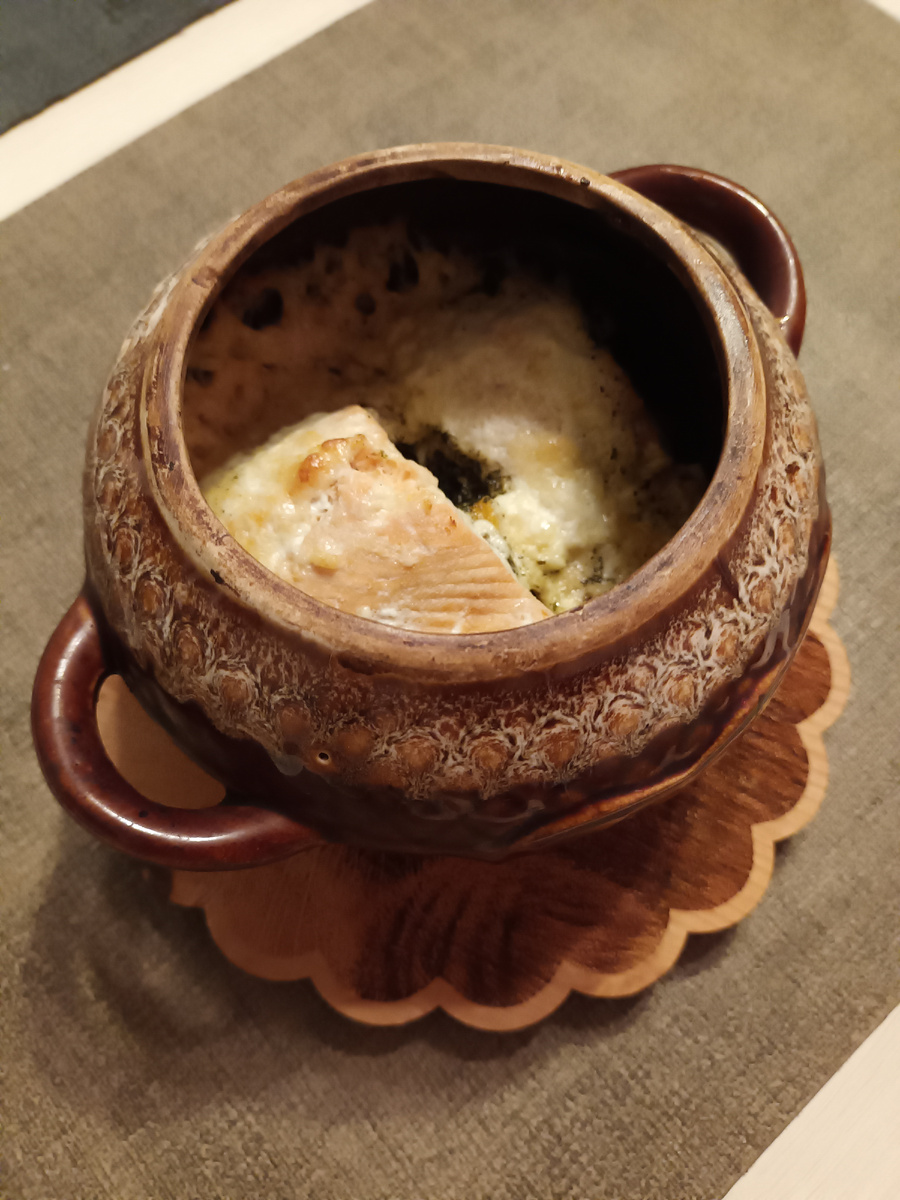 Горбуша в горшочках с тыквой, сметаной и сыром