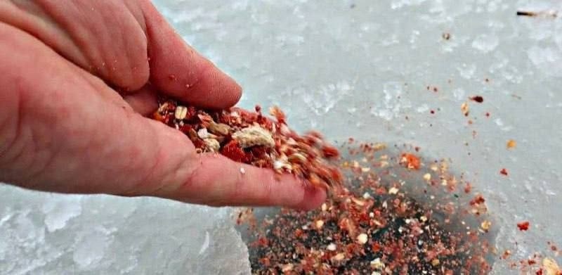 - Кидайте прикормку в лунку максимально осторожно, стараясь минимизировать шум, особенно если используете шарики.