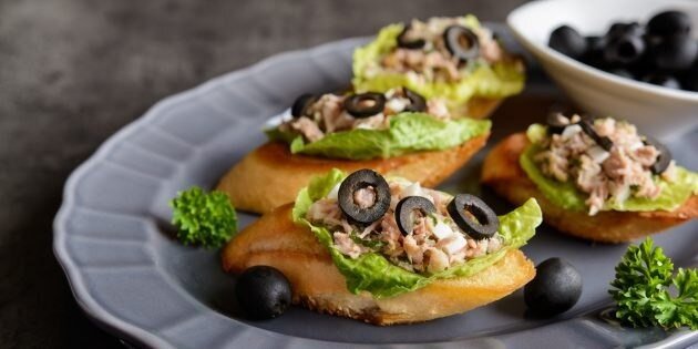Теперь натрите хлеб чесноком для аромата. На каждый ломтик положите по листику салата, затем выложите рыбную массу и украсьте кружочками маслин. Ваши бутерброды готовы!
