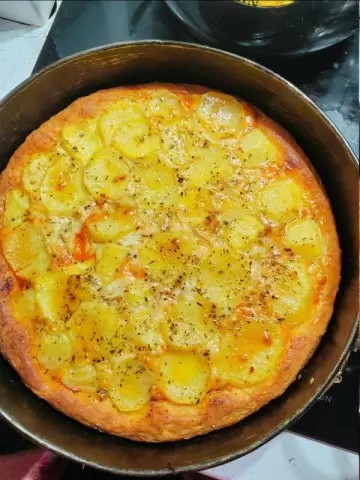 Готовое тесто выкладывают в форму и равномерно распределяют по дну. Сверху смазывают смесью кетчупа и майонеза. Равномерно раскладывают кружочки картофеля, посыпают рубленным чесноком и кольцами лука. Завершают укладку оставшимися кружочками картошки и щепоткой прованских трав.