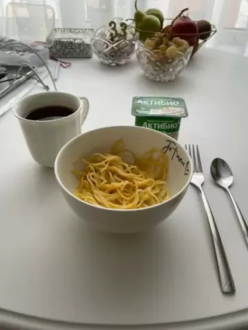 Вчерашний день начинался с аппетитного завтрака. На тарелке уютно разместились спагетти, нежно переплетённые с яичницей. Кроме того, утро озарял йогурт и щедрая горсть сочного винограда, дарящего свежесть.