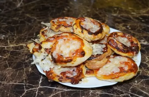 Технология проста: тесто раскатывают, высыпают ингредиенты поверх и сворачивают в рулет. Затем нарезают на маленькие порционные куски и запекают до золотистости, после чего возвращают в духовку для завершающей подрумяненности сыра.