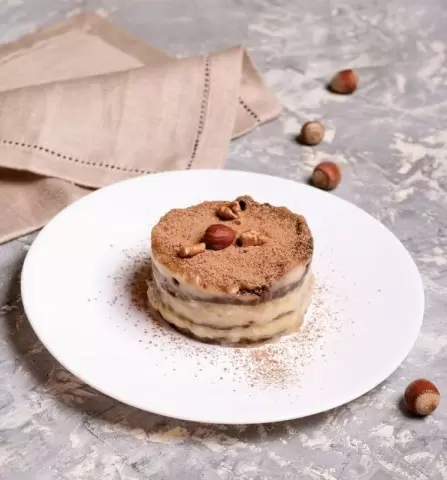 Этот десерт станет настоящим открытием для любителей шоколада! В его основе – бисквиты из какао и орехов с насыщенным, глубоким вкусом, который прекрасно дополняется нежным банановым кремом. Крем, приготовленный из спелых бананов с добавлением лимонного сока, создаёт тропический аромат и идеальный баланс сладости. Это деликатес, который порадует всех, кто хочет насладиться изысканной сладостью без вреда для здоровья.