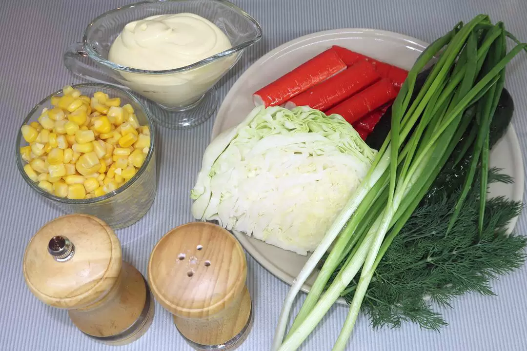 Теперь все подготовленные ингредиенты комбинируем в салатнике с капустой: добавляем огурцы, крабовые палочки и кукурузу, которая должна быть заранее отцежена. Приправляем салат черным перцем и добавляем несколько ложек майонеза, который, по желанию, можно заменить сметаной или натуральным йогуртом.