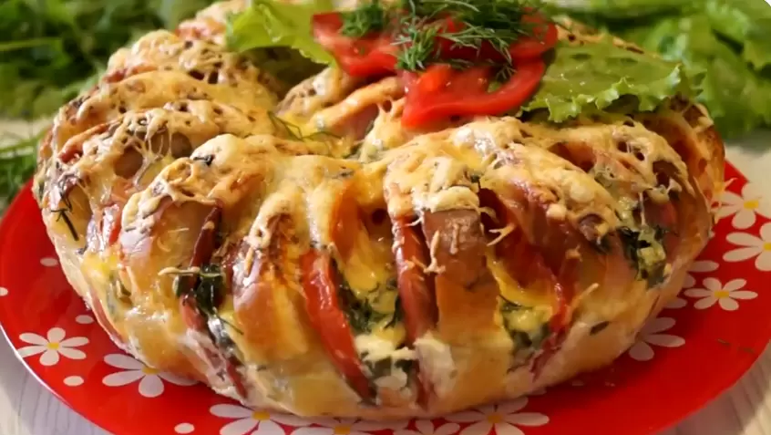 Готовый пирог аккуратно переложить на блюдо и подавать к столу горячим. Это идеальное решение для вкусного и быстрого завтрака, которое оценит вся семья!