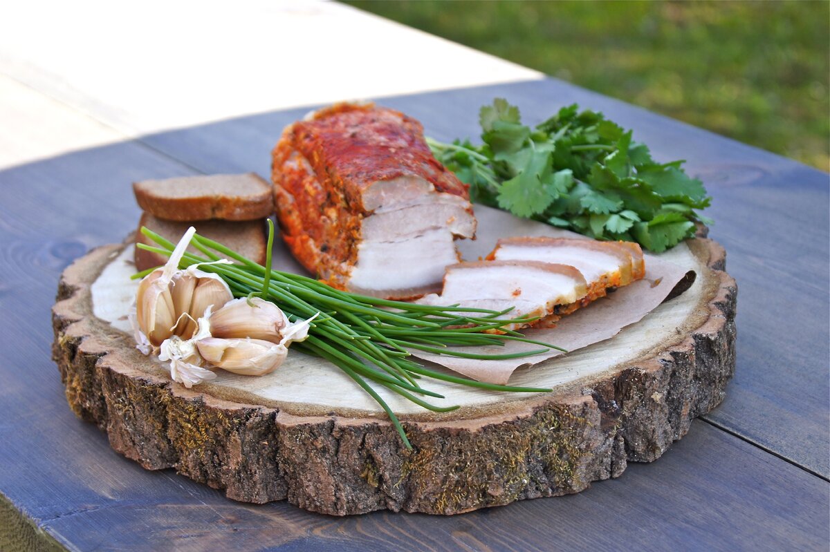 Когда время истечёт, достать грудинку, дать ей остыть до комнатной температуры и затем убрать в холодильник ещё на пару часов. Теперь вкуснейшая закуска готова — самое время нарезать и подать на стол, украсив нарезкой свежих овощей и зелени.