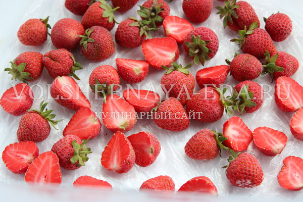 Если планируется использование клубники в выпечке или для приготовления салатов, имеет смысл нарезать ягоды на половинки. Перед заморозкой каждую половинку укладывают разрезом вверх на поднос и оставляют в морозильной камере до полного застывания. После этого пересыпают в контейнеры для хранения.