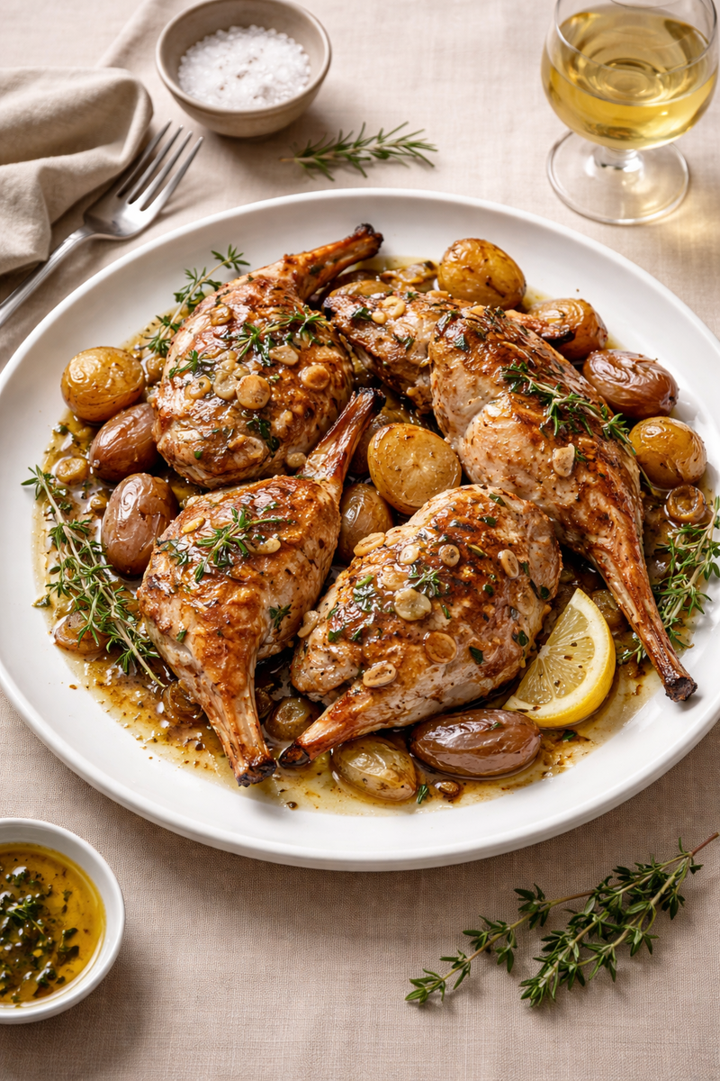 Кролик великолепно сочетается с тимьяном, розмарином, шалфеем, чесноком и лавровым листом. Эти травы подчеркивают вкус мяса, не перегружая его. В качестве гарнира отлично подойдут морковь, лук, сельдерей, грибы и картофель — они создают вкусную основу и не отвлекают от основного ингредиента.