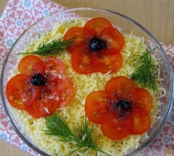 Этот слоёный салат обязательно удивит ваших гостей своим удивительным вкусом и потрясающим внешним видом. Приятного аппетита!