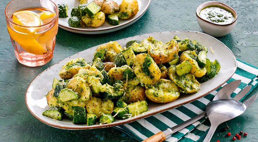 Этот картофельный салат с лимонными огурчиками и ароматным песто — свежий взгляд на традиционное блюдо. Он сочетает в себе нежный картофель, яркие лимонные огурчики и насыщенное песто, что делает его отличным вариантом для летнего обеда или ужина на свежем воздухе, сообщает Еда от ШефМаркет.