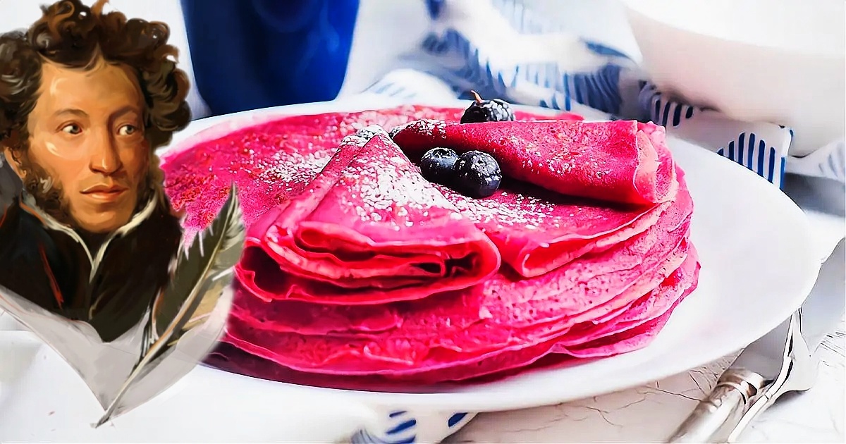 На этот раз внимание к себе привлекает необычное блюдо — Пушкинские блины. Почему они такие? Всё просто — их главная изюминка в свекольном соке!