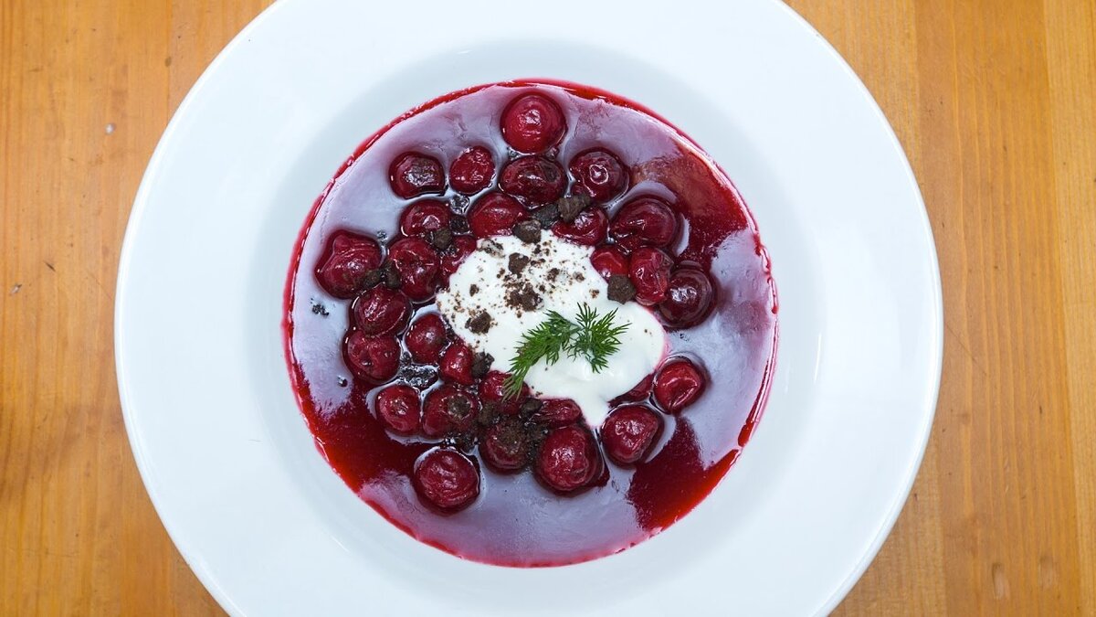 Готовый вишневый суп перелите в тарелку, добавьте чайную ложку сметаны, украсьте свежими листочками укропа и крошкой печенья — получившийся десерт скоро станет любимым в вашем арсенале!