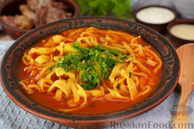 - Суп с говядиной и домашней лапшой: богатый бульон с говяжьей голяшкой, картофелем и томатной зажаркой. А чтобы вкус был ещё более выразительным, добавляется домашняя яичная лапша.