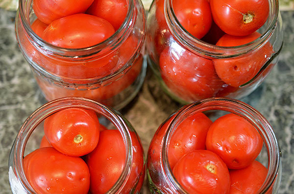 1. Помидоры нужно аккуратно надрезать в нескольких местах с помощью зубочистки, чтобы они впитали сок. Затем помещаем их в стерилизованные банки и заливаем кипятком. Процесс необходимо повторить 3-5 раз, чтобы помидоры стали мягче.