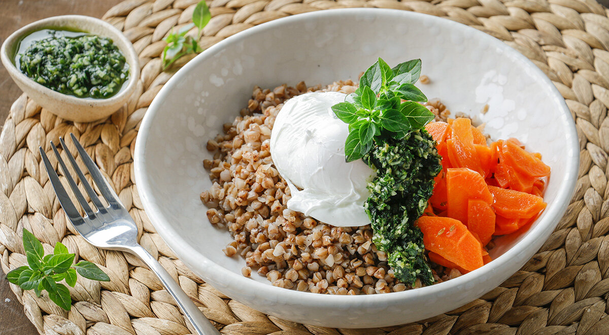 - Гречневая каша с припущенной морковью и яйцом — сытный и питательный завтрак, к которому рекомендуется добавить немного быстрого песто для уникального вкуса.