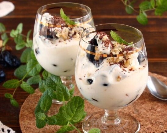 Фаршированный чернослив укладывают в порционные формы, перемежая их со сметаной, посыпают тертым шоколадом и орехами. Украшают листьями мяты.