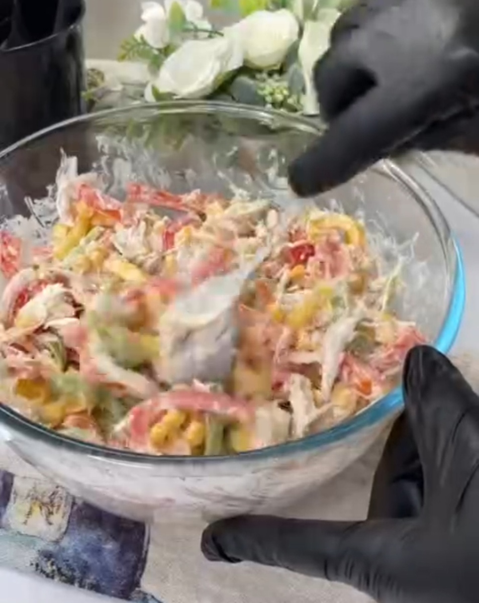 5. В глубокой миске смешать все подготовленные компоненты, добавить соль, перец и заправить все майонезом, тщательно перемешать.