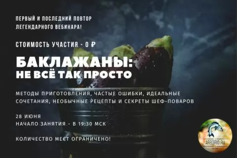 Несколько лет назад состоялся вебинар «Баклажаны: не всё так просто», который оказался весьма популярным. Сотни писем от подписчиков свидетельствуют о том, что многие его пропустили, и именно поэтому организуется повторная трансляция — и лишь на один раз.
