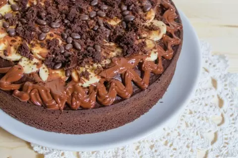 - Украшение — дело вкуса. Я украсила торт бананами, шоколадными семечками и крошкой бисквита. Можно использовать всё, что под рукой!