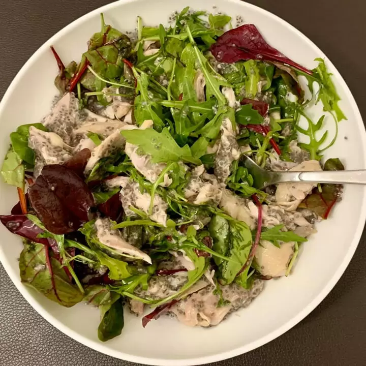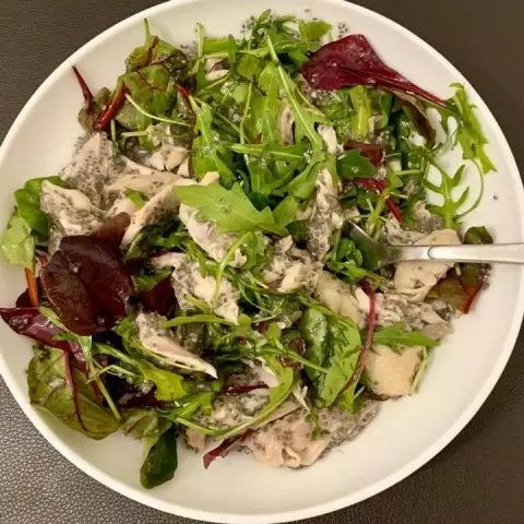 На дно глубокой миски укладываются листья салата, затем добавляется мясо перепёлок и поливаются семена чиа. Все ингредиенты аккуратно перемешиваются, создавая гармоничное сочетание вкусов и текстур.
