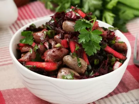 Этот сытный и ароматный салат с сердечками курицы и свеклой станет настоящим украшением любого стола. Он удивляет своей простотой, но при этом способен порадовать даже самых взыскательных гурманов. В состав входят хрустящий огурец, сладкая свекла и яркий зелёный лук, которые вместе создают гармоничное сочетание вкусов и текстур.