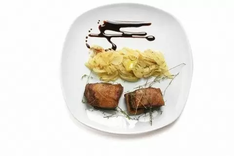 Сопроводите ребра ароматным гарниром. Для этого нарежьте лук полукольцами и выложите в другой сотейник. Добавьте уксус, сливочное масло, соль, перец и сахар. Тушите до тех пор, пока вся жидкость не испарится. Получившуюся смесь подавайте вместе с копчеными ребрами и добавьте немного бальзамико для усиления вкуса.
