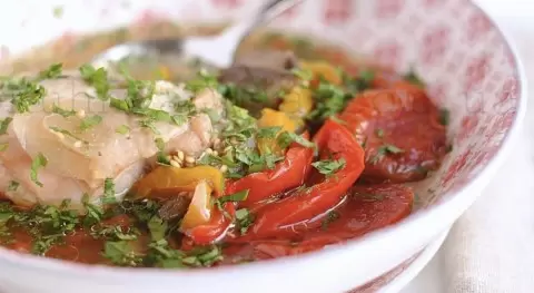 На сковороду с маслом обжариваем репчатый лук до полупрозрачности. Затем добавляем баклажаны и жарим до золотистой корочки. После этого в сковороду идут острый и сладкий перцы, все овощи хорошо перемешиваются, солятся и перчатся, после чего накрываются крышкой и тушатся 5 минут. Помидоры очищаем и нарезаем кубиками, добавляем к овощам и через пару минут снимаем с огня.