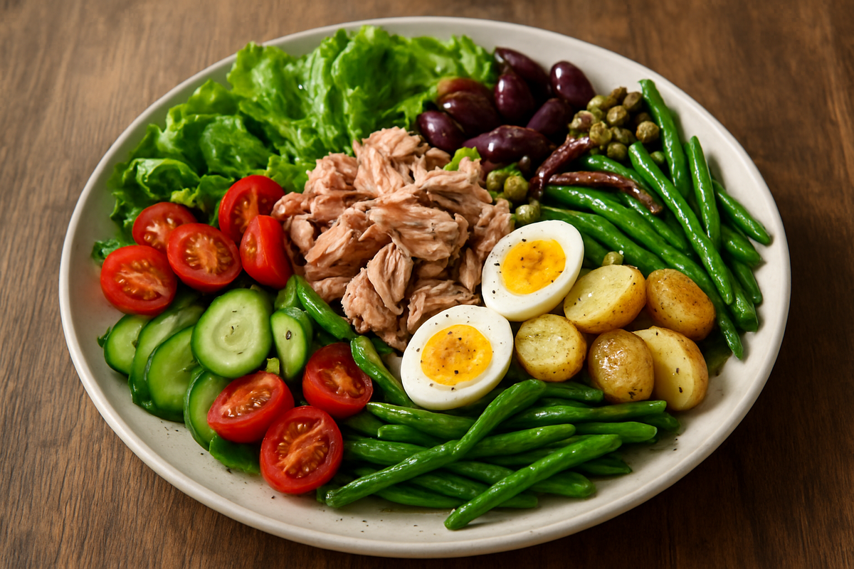Идея проста: блюда, сформированные временем и морем, повторяются в каждом доме и сохраняют характер. В салате Нисуаз ключевые детали — хрустящие овощи, тунец и анчоусы — работают вместе, чтобы передать солнечное настроение Лазурного побережья.
