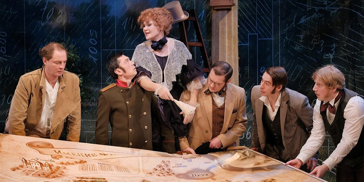 Пьеса «Завтрак у предводителя» впервые была представлена на сцене Малого театра в 1849 году, в том же году, когда была написана. Ведущие театроведы обсуждали, как классифицировать произведение: это комедия, сатира или бытовая драма? Тургенев рисует образ провинциальной жизни с ехидным юмором, смешивая повседневность с элементами гротеска, что перекликается с темами Гоголя. В отличие от свойственных Тургеневу лирических образов, эта работа стала более экспериментальной, открывая пространство для новых интерпретаций. Режиссёр Юрий Буторин нашёл в произведении сочетание лёгкости и трагичности, что нашло отражение в спектакле. Он представляет его как комедию положений с преувеличенной мимикой и динамическими сценами, в которых присутствует дух Бастера Китона и Чарли Чаплина, вплетая элементы акробатики и комики.