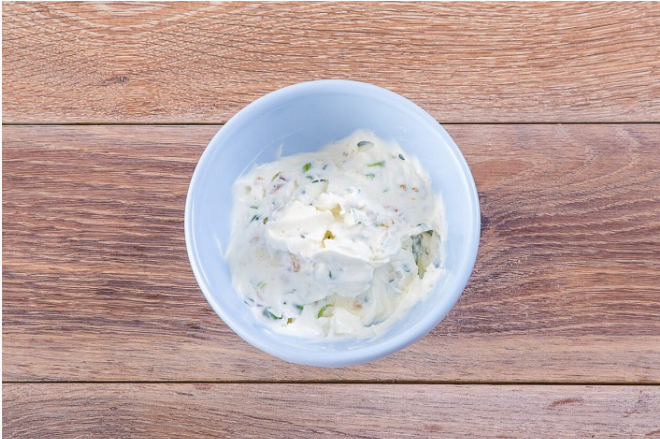 Шаг 2: Половину огурца нарежьте кружками, а остальную часть — кубиками. Чеснок очистите и раздавите, затем нарежьте мелко и разотрите в пасту. Листья тархуна также мелко порежьте, оставив немного для сборки бургера. Для соуса смешайте сметану, чеснок, кубики огурца и тархун, добавьте хмели-сунели, посолите и охладите в холодильнике на 10 минут.
