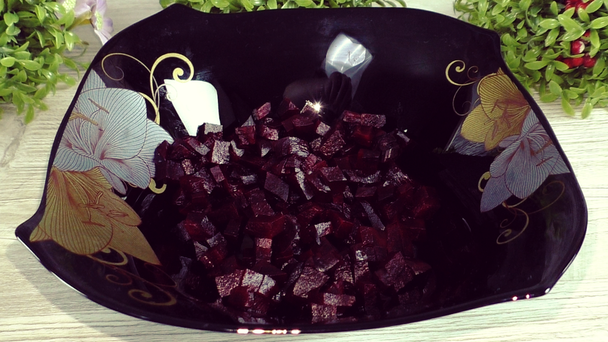 Для начала необходимо отварить свёклу, либо запечь в духовке или приготовить в микроволновой печи. После этого свёклу нужно охладить, очистить и нарезать на средние кубики.