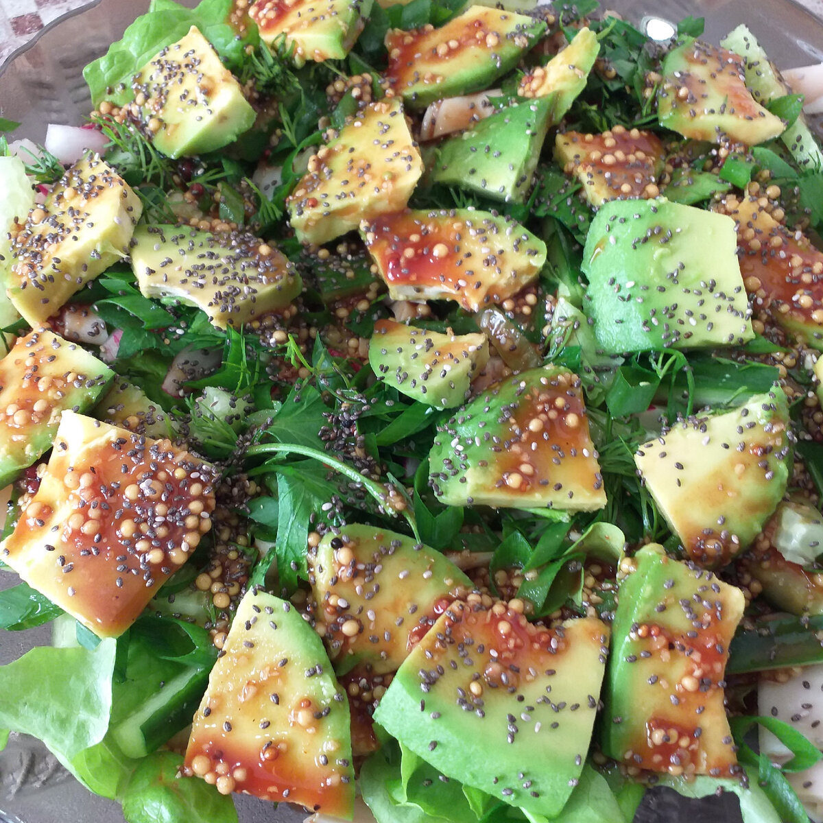 5. Полейте все пикантной заправкой и при желании посыпьте семенами чиа для дополнительного вкуса и пользы.