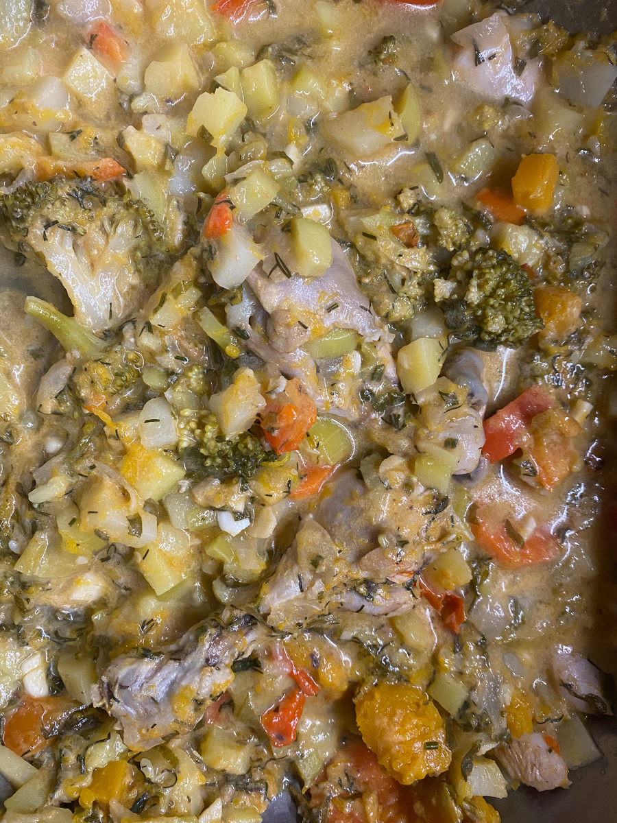 Затем пришло время добавить остальные овощи, за исключением брокколи и чеснока, которые добавили позже для большей свежести. Все оставалось аккуратно перемешивать и тушить в течение 30 минут с добавлением сметаны и воды.