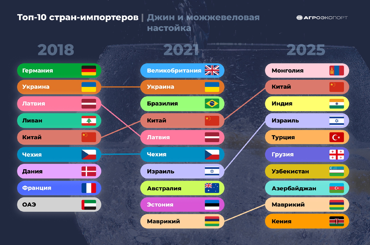 - Ключевые страны-импортеры джина и можжевеловой настойки из России;